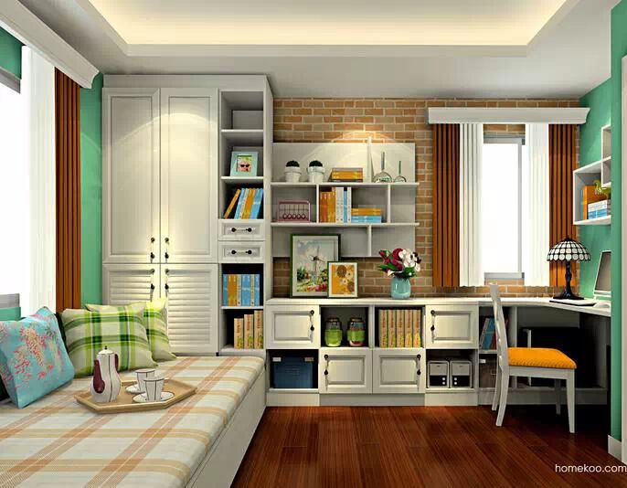 从提升空间利用率来说,通常可以在房间的转角位置打造工作区。在书桌的选择上,可以选用带有抽屉和搁架形式的,增加储物性。
