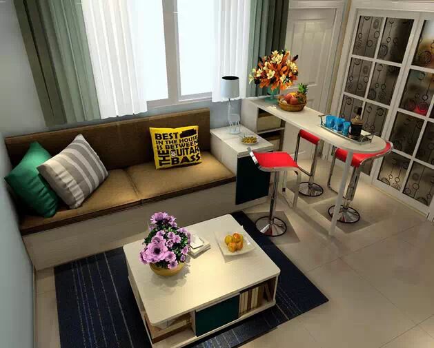 在沙发旁边的位置设计个简约吧台,不仅拥有了一个时尚的休闲区,而且自然成为了客厅与厨房的隔断。