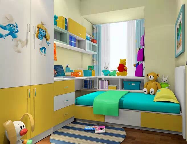 将书桌和飘窗结合起来,释放了空间供孩子玩耍。抽屉收纳床大大提升收纳性,便于收纳玩具杂物。