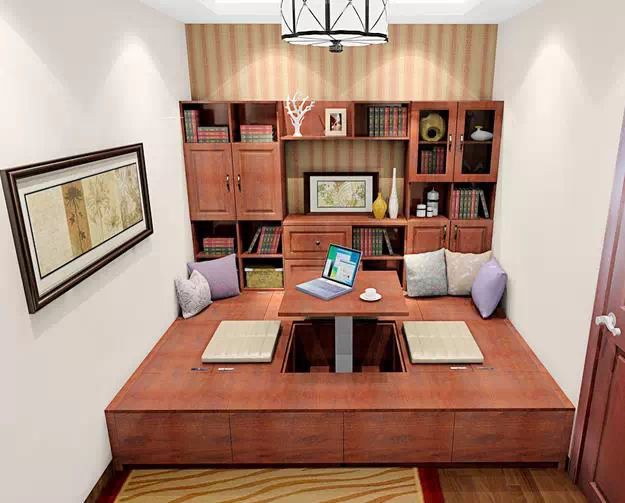 榻榻米加拼搭式书柜,榻榻米的升降台可以作为独立书桌,拼搭的书柜采用对称式设计结构,看上去整体大气。