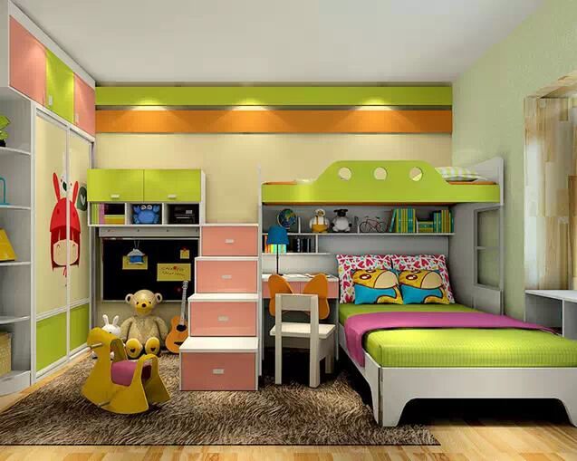 可以设计上下床,下床1.5米,满足老人睡眠需求,上床1米,打造孩子的睡眠空间。衣柜和书桌组合满足储物等功能。