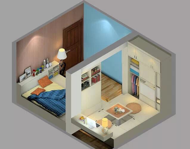 要善于利用凹位,根据凹位的深度设计了一个转角书桌。同时布置了由榻榻米拼搭衣柜的设计,实现了多功能用房的需求。